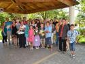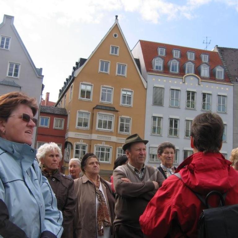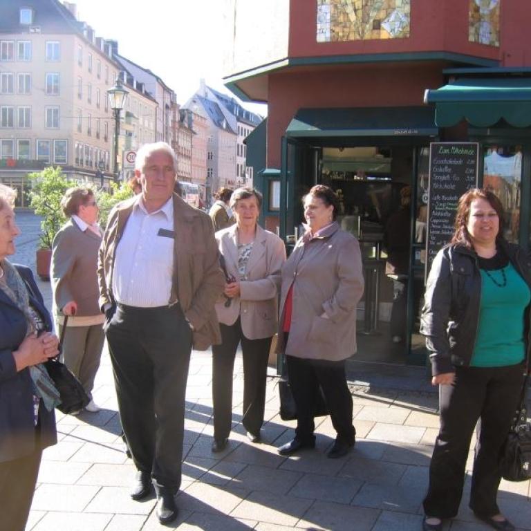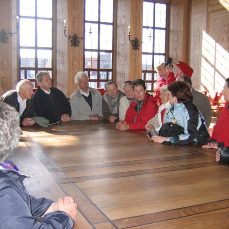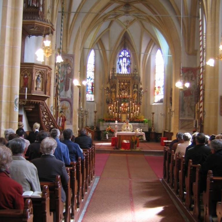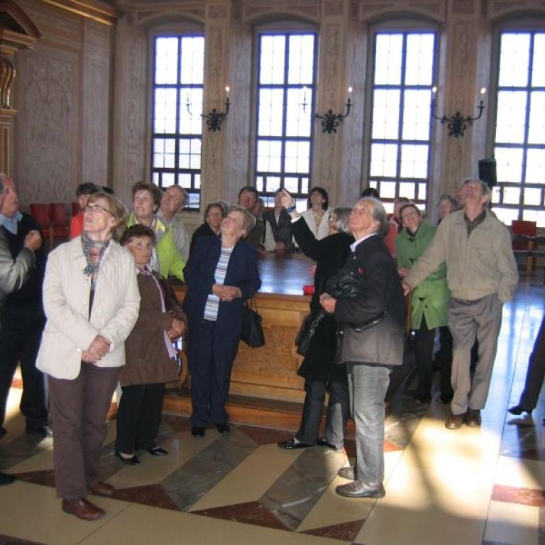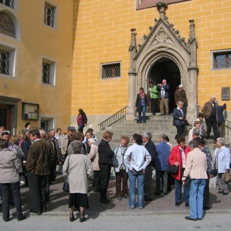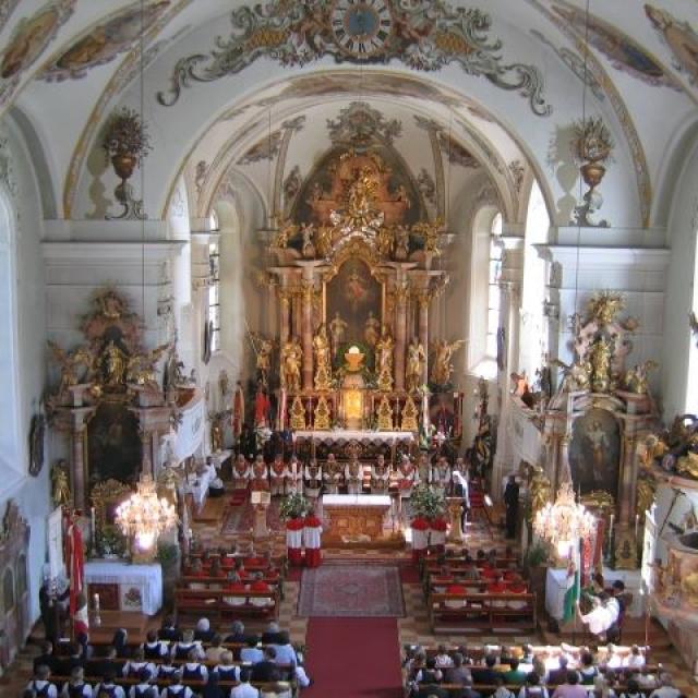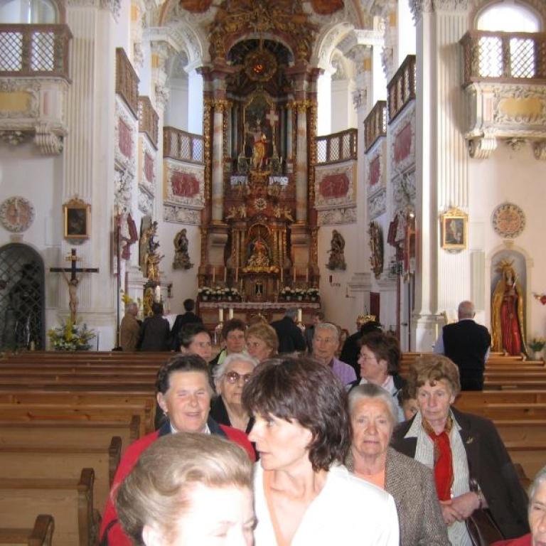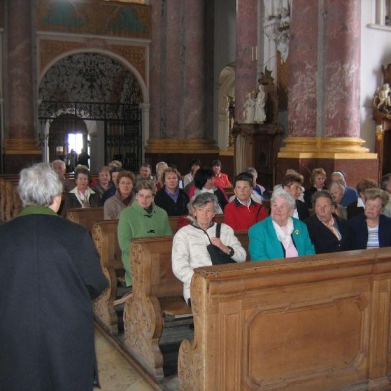 Anschließend erklärte uns Dr. Josef Riedmann in seiner unnachahmlichen Art die Besonderheiten unserer Kirche. Die halbe Stunde war in kaum 10 Minuten vorbei. Danach konnte unsere Kirche unter fachmännischer Betreuung besichtigt werden. Einmal die Monstranz aufheben (9,80 kg), einmal von der Kanzel "ledern , auf den Kirchturm steigen, die Orgel vom Chef erklären lassen