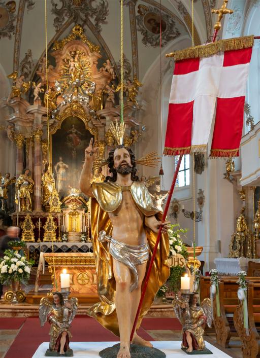 Im Rahmen einer Andacht mit Pfarrer Paul Rauchenschwandtner, musikalisch gestaltet vom Männerchor Oberau und dem Mandergsang 3spitz, konnten die zahlreich Erschienenen aus Nah und Fern verfolgen, wie sich unter prächtigem Orgelton und vollem Glockenklang der Auferstandene langsam an einem Strick mit den begleitenden Engeln aufwärts bewegt hat.